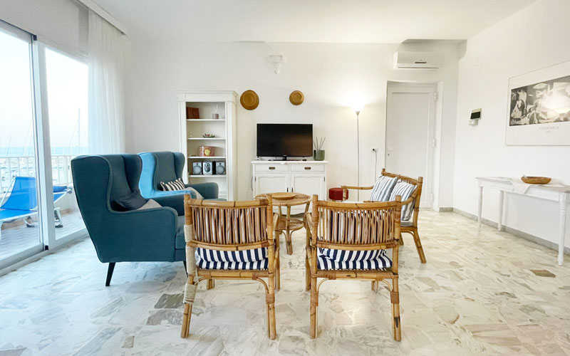 L'appartamento comprende un soggiorno luminoso e interamente climatizzato che si affaccia sul porto turistico, un cucinino attrezzato (piano cottura forno, frigorifero e freezer, piatti, bicchieri, posateria e pentolame, lavastoviglie, lavatrice, tavolo e ferro da stiro), tre camere da letto (così suddivise: una camera matrimoniale climatizzata e con ventilatore a soffitto, una camera matrimoniale con ventilatore a soffitto, una camera doppia convertibile climatizzata e con ventilatore a soffitto), un bagno interno, un bagnetto esterno.
