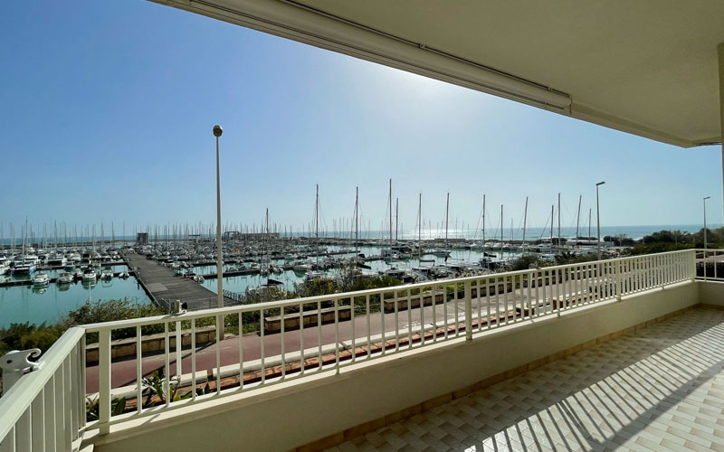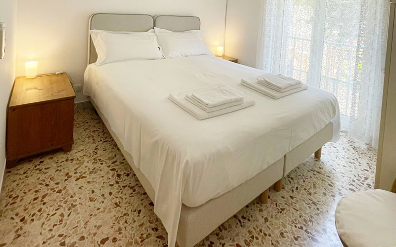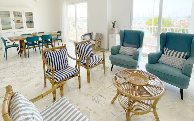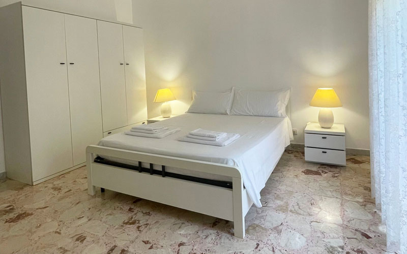 L'appartamento comprende un soggiorno luminoso e interamente climatizzato che si affaccia sul porto turistico, un cucinino attrezzato (piano cottura forno, frigorifero e freezer, piatti, bicchieri, posateria e pentolame, lavastoviglie, lavatrice, tavolo e ferro da stiro), tre camere da letto (così suddivise: una camera matrimoniale climatizzata e con ventilatore a soffitto, una camera matrimoniale con ventilatore a soffitto, una camera doppia convertibile climatizzata e con ventilatore a soffitto), un bagno interno, un bagnetto esterno.
